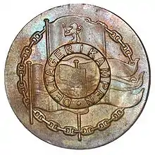 На реверсі – композиція з трьох прапорів: королівського, торговельного та збройних сил, накладених на кільце з судового ланцюга. Поверх композиції, в центрі медалі кільце з написом: «DELTAGER I KAMPEN». У верхній частині медалі припаяне кільце, за допомогою якого медаль кріпиться до стрічки. Стрічка медалі червоного кольору з широкою білою смугою по центру обтяжена двома синіми смужками.