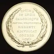 | 1804 | Джон Леслі | За «Експерименти над теплом», опубліковані у складі праці під назвою «Експериментальне вивчення природи та поширення тепла» | For his Experiments on Heat, published in his work, entitled, An Experimental Enquiry into the Nature and Propagation of Heat | [2] | |