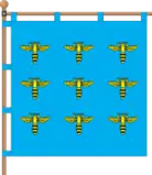 Прапор Меденич: квадратне синє полотнище, на якому зображено 9 жовтих бджіл у три ряди 3 : 3 : 3. Вулики і бджоли вказують на назву селища, на поширені тут давніше бджолярські промисли, а також символізують працелюбність і добробут.[6]
