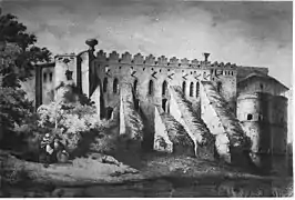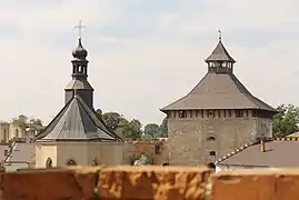 - Меджибізький замок з мурами, вежами, каретнею та церквою.