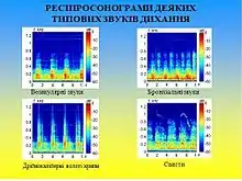 Для побудови таких зображень використовують алгоритми побудови спектрограм (сонограм)[8]. Зареєстровані дані про звуки під час декількох циклам дихання (в даному випадку чотири цикли) після спектрального аналізу представлено у вигляді кольорових зображень. По горизонталі відкладено час, по вертикалі значення частоти. З допомогою кольору можливо відобразити інтенсивність звуку відповідної частоти. Візуальне порівняння таких зображень для конкретного пацієнта з типовими «стандартними» зображеннями для різних додаткових звуків дихання дозволяє підвищити надійність діагностичної процедури.
