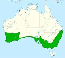 Ендемік Австралії. Птах поширений вздовж південного і південно-східного узбережжя. Трапляється на південному сході Квінсленда, у Новому Південному Уельсі, Вікторії, Південній Австралії, а також на півдні та південному заході Західної Австралії. Тричі бродяжні особини спостерігалися в Новій Зеландії. Мешкає у відкритих лісах, лісистих місцевостях та поблизу населених пунктів.