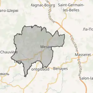 - Розташування муніципалітету Мезак на мапі Франції та сусідні муніципалітети