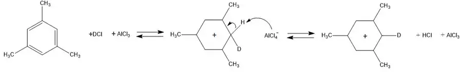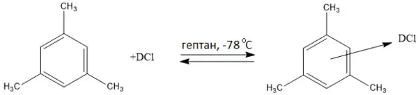 У пропорції 1:1 цей мономолекулярний комплекс не є забарвленим, а його розчини у органічних розчинах не є електропровідними, тобто не містять йонів. Мезитилен (π-основа) утворює із DCl (кислота) за низької температури донорно-акцепторний комплекс, який називається π-комплексом. У цьому комплексі обмін дейтерієм не відбувається.
