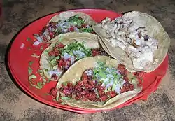 - Тако (taco) — кукурудзяна тортилья обгорнена навколо начинки з яловичини, свинини, бобів або молюсків;