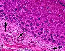 Меланоцити знаходяться в найнижчому (базальному) шарі епідермісу,[13] і вони використовують свої дендрити для взаємодії з клітинами верхніх шарів[14] та для захоплення патогенних мікроорганізмів, які потрапляють в епідерміс.[11] Меланоцити, ймовірно, працюють узгоджено як з кератиноцитами, так і з клітинами Лангерганса,[10] що також активно фагоцитують.