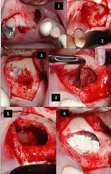 1) Беззуба ділянка (двох відсутніх зубів) готується для подальшого встановлення зубних імплантатів з боковим підйомником синуса, тут видно розрізи на м'яких тканинах.
