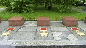 - Декоративні елементи у вигляді гранітних плит розміром 0,8 х 0,8 х 0,6 метра (13 штук) з назвами міст—героїв і зображенням зірки Героя Радянського Союзу утворюють дві алеї — праворуч і ліворуч. По центру кожної з алей встановлені металеві колби із землею з відповідних міст-героїв. Напис свідчить: