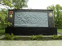- Стіна пам'яті, довжиною 21 метр, заввишки 4,5 метра, на металевих плитах якої написані прізвища загиблих, інша стіна, яка примикає до неї, розміром 8,9×4,5 м, прикрашена великим панно, виконаним з металу, що зображує вояків Червоної Армії, що йдуть в атаку, а також зображеннями зірки Героя Радянського Союзу і Ордена Великої Вітчизняної війни, цоколь облицьований чорними гранітними плитами.