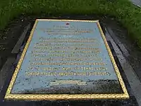 - При вході в меморіальний комплекс встановлені два стилізовані схилені прапори (бетон, 3,0 х 1,5 м) та дві гранітні плити.