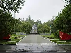 - Скульптурне зображення Скорботної матері на фігурному постаменті з сірого граніту. Скульптура відлита з чавуну на машинобудівному заводі ім. Петровського, висота її 3,5 метра, постамент розмірами 3,5 х 8,0 х 6,0 метрів. Перед скульптурою на узвишші з полірованих гранітних плит розміщене вогнище Вічного вогню у вигляді п'ятикутної зірки з пофарбованої сталі (діаметр 1,2 метра). Поверхня подіуму, на якому встановлений постамент з фігурою Скорботної матері, вимощена плитами з чорного полірованого граніту, прикрашена зліва барельєфним зображенням воїна Радянської Армії і більшовицького бійця часів українсько-більшовицької війни, поруч розташована могила невідомого солдата.
