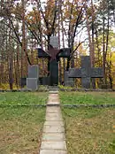 За даними КДБ у Харкові і Старобільську було розстріляно 3 820 інтернованих польських офіцерів[18]. Загалом на цвинтарі у Харкові поховані 4300 розстріляних НКВС поляків та близько 3000 представників різних національностей колишнього СРСР[19]. Меморіальний комплекс на місці поховання був відкритий 17 червня 2000 року за ініціативи президентів України та Польщі. | Лісопаркова зона, 6-й квартал лісопарку 48°24′49″ пн. ш. 33°42′10″ сх. д. | |