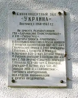 ![]() | На дошці написано: рос. Киноконцертный зал «Украина» построен в 1960-1963 г.г. по проекту, разработанному ГПИ «Харьковский Промстройпроект» и ХФ «Гипроград». Авторы проекта: архитекторы – В. Васильев, Ю. Плаксиев, В. Реусов, инженер Л. Фридган, коллективами УНР-427 – нач. Г. Марковский, прораб А. Роев; бригадиры – Н. Кукленко, Е. Карабута, И. Нефедов, М. Левченко; ХСУ-3 – нач. Безунов, прораб Ф. Рубанов, бригадир В. Беседин; УНР-431 – нач. С. Лев, прораб – Г. Эпштейн, бригадир – Т. Кокайло; ХСУ-401 – нач. Б. Прокудов, бригадир – П. Петров; ХСУ-508, 402, заводов ЖБК-4, «Харпластмас», Торгового оборудования, Обл. отдела кинофикации и других предприятий. | Вул. Сумська, 35 (ККЗ «Україна») | |