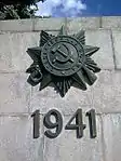 В центрі меморіалу розташована бронзова скульптура радянського бійця висотою 6,5 метрів, який тримає щит та піднятий вгору 3-метровий меч. Скульптура стоїть на 18-метровому кам'яному пілоні[1].