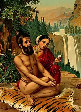 ![]() Менака спокушає Вішвамітра. Картина Раджі Раві Варми | |
