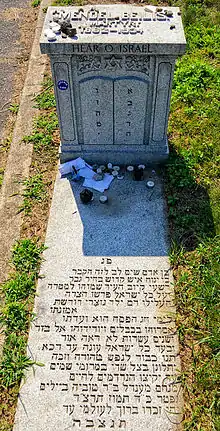 | «Зверніть увагу на цю могилу. Тут спочиває святий чоловік, обраний. Кияни зробили його жертвою звинувачення в тому, що він і його одновірці взяли кров християнської дитини для святкування Великодня. Цього чоловіка, як сина ізраїлевого, піддавали жорстоким тортурам. Вшануйте пам'ять цієї чистої невинної душі, що вознеслась до раю. Менахем Мендель Бейліс, син Тувії, помер 24 Тамуза 5694 року за єврейським календарем. Нехай буде вічно благословенна пам'ять про нього»[4]. |