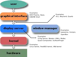 У системах з використанням X Window System існує чітка межа між менеджером вікон та віконною системою. Тобто в X Window менеджери вікон не взаємодіють напряму з відеообладнанням, мишкою або клавіатурою, які під'єднані до X-сервера, а роблять це через ядро віконної системи.