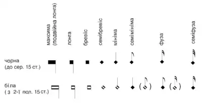 В основу графіки мензуральної нотації були покладені графеми римської квадратної нотації, для яких характерна квадратно-ромбоїдальна форма. Розрізнялися прості фігури (figurae), тобто одиночні ноти — максима, лонга, бревіс, семібревіс, пізніше мініма і семімініма, фуза і семіфуза, яким відповідали паузи відповідної тривалості, і лігатури (ligaturae). Для ритмічної розшифровки лігатур були встановлені розгалужені, дуже громіздкі правила.