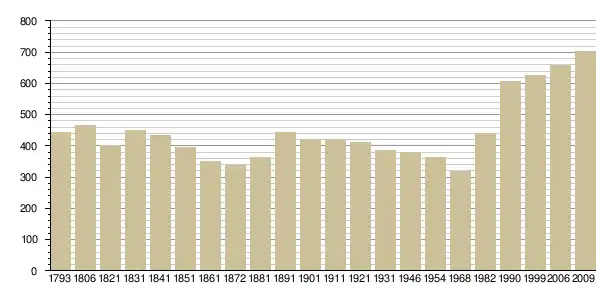 Динаміка населення (base Cassini de l'EHESS pour les nombres retenus jusque 1962[3], base Insee à partir de 1968 (population sans doubles comptes puis population municipale à partir de 2006)[4] · [5] ):