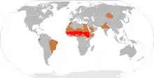 Хоча менінгіт є захворюванням, яке підлягає обов'язковій реєстрації у багатьох країнах світу, точна кількість випадків невідома.[27] Щорічно у країнах Західного світу на кожні 100 тисяч осіб припадає 3 випадки захворювання. Дослідження серед населення виявили, що найбільш поширеним є вірусний менінгіт (10,9 випадків на 100 000 осіб), а найбільш сприятливою для цього захворювання порою року є літо. Країни Африки на південь від Сахари потерпають від хронічної епідемії менінгококового менінгіту,[36] через що цей регіон назвали «менінгітним поясом». Епідемії здебільшого припадають на сухий сезон (з грудня по червень), і можуть тривати від двох до трьох років, стихаючи після настання сезонів дощів.[37] У цьому регіоні[38] з низьким рівнем медичної допомоги кількість випадків захворювання на 100 тисяч осіб становить 100—800.[11] Під час найбільшої в історії епідемії, яка накрила весь регіон у 1996—1997 роках, було зафіксовано більше 250 тисяч випадків хвороби, 25 тисяч з яких закінчилися смертю хворих.[39]