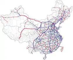 Мапа швидкісних автодоріг Китаю[1]. Синім позначено діючі магістралі, червоним — ті, що споруджуються, та заплановані