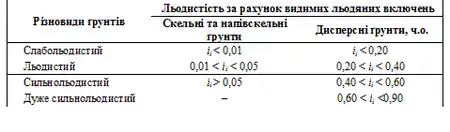 Різновиди мерзлих ґрунтів (згідно з ДСТУ Б В.2.1-2-96) виділяють також за льодистістю за рахунок видимих льодяних включень ii (співвідношення об'єму видимих льодяних включень, що містяться в ньому, та об'єму мерзлого ґрунту) (табл.).