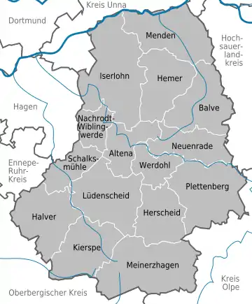 Район поділяється на 3 комуни (нім. Gemeinden) та 12 міст (нім. Städte):