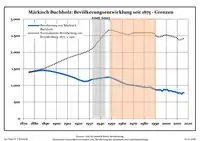 Динаміка населення з 1875 року в сучасних кордонах (Синя лінія: населення; Пунктир: відносна порівняльна динаміка населення землі Бранденбург; Сірий фон: період Третього рейху; Помаранчевий фон: період НДР)