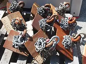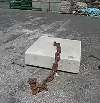 - Залізобетонний якір («жабка») — у вигляді зрізаної піраміди із залізобетону, з виїмкою в нижній частині і обухом для якірного ланцюга у верхній.