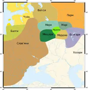 ![]() Мапа фіно-угорських племен до приходу слов'ян | |