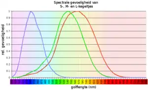 Вищі примати (вузьконосі та частково широконосі мавпи), зокрема і люди, мають три типи колбочок; світлочутливі пігменти в цих колбочках здатні сприймати колір переважно у фіолетово-синій, зелено-жовтій і жовто-червоній частинах спектра. Діапазони чутливості цих трьох типів колбочок частково перекриваються[5][6]. Від колбочки до головного мозку надходить сигнал, що кодує інтегральне значення інтенсивності світлового випромінювання у відповідній частині спектра. Таким чином, людський колірний зір є тристимульним аналізатором: характеристики кольору виражаються лише у трьох значеннях. Якщо колір із різним спектральним складом чинить на колбочки однакову інтегральну дію, відповідні кольори сприймаються як однакові.