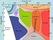 До основних фацій метаморфізму належать: фація зелених сланців (зеленокам'яна), амфіболітова, гранулітова. В результаті метаморфізму утворюються метаморфічні породи[1].