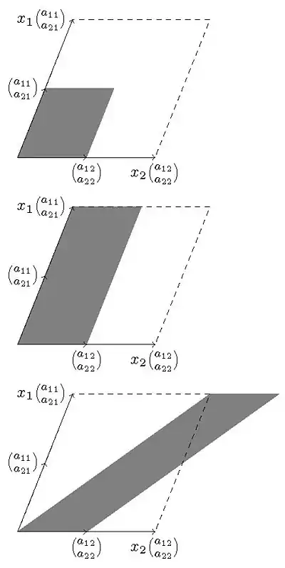 Отже, площа паралелограма, визначеного і , дорівнює помножено на площу першого, оскільки одну зі сторін помножили на цей коефіцієнт. Тепер останній паралелограм, за принципом Кавальєрі, має ту ж площу, що і паралелограм, визначений через та