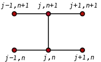 В схемі Кранка-Ніколсон використовується шість точок основної різницевої сітки для наближення проміжної точки , на якій базуються всі чисельні наближення.
