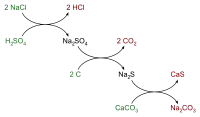 - Na2SO4 + 2C + CaCO3 → Na2CO3 + CaS + 2CO2↑