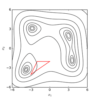 Послідовні симплекси в функції Нелдера-Міда для Функції Розенброка (вгорі) та функції Химмельблау (внизу) | |