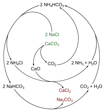 Вуглекислий газ, отриманий на стадіях 3 та 5 використовується у взаємодії 4. Аміак, отриманий на стадії 6, повертається на стадію 4. Його присутність в реакційній системі у формі гідрокарбонату амонію сприяє утворенню гідрокарбонату натрію: