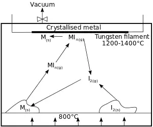 Неочищені метали з добавкою деякої кількості йоду поміщають на дно герметичної камери. Зону камери, де знаходиться ця суміш, розігрівають до температури 400—800 °C (в залежності від очищуваного металу), при цій температурі утворюється йодиди металу і які при такій температурі знаходиться в газоподібному стані. Потім йодид металу потрапляє в зону камери, нагріту до температури його розкладання (1300—1700 °C). В ній відбувається розкладання йодида з виділенням чистого металу на стінках камери. Йод, що залишився після розкладання потрапляє назад в зону низької температури, взаємодіє з новою порцією металу, і цикл повторюється, поки в зоні низької температури не залишаються домішки, які з йодом не взаємодіють.