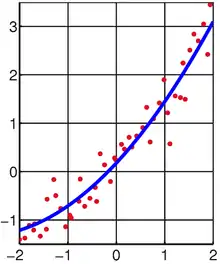 Важливо, що у методі лінійних найменших квадратів ми не обмежені використанням прямої як моделі як у попередньому прикладі. Наприклад, ми могли вибрати обмежену квадратичну модель .[1] Ця модель все ще лінійна в сенсі параметру , отже ми все ще можемо здійснювати той самий аналіз, будуючи систему рівнянь з точок даних: