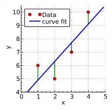 Нехай в результаті деякого досліду отримано чотири точки даних: і (на малюнку ліворуч позначені червоним). Потрібно знайти пряму , яка найкраще підходить для цих точок. Інакше кажучи, ми хотіли б знайти числа і , які приблизно розв'язують надвизначену лінійну систему