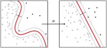 Припустімо тепер, що ми хотіли би вчитися нелінійного правила класифікації, яке відповідає лінійному правилу класифікації для перетворених точок даних Крім того, в нас є ядрова функція , яка задовольняє .