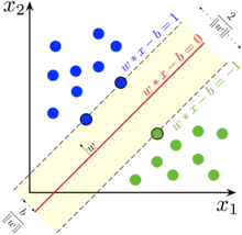З геометричної точки зору, відстанню між цими двома гіперплощинами є ,[10] тож для максимізації відстані між ними нам треба мінімізувати . Оскільки ми також маємо завадити потраплянню точок даних до розділення, ми додаємо таке обмеження: для кожного , або