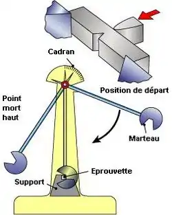 При при цьому визначають ударну в'язкість (в кгс×м/см² або МДж/м²) — роботу деформації та руйнуванні зразка, що умовно припадає на одиницю площі поперечного перерізу зразка у місці надрізу.