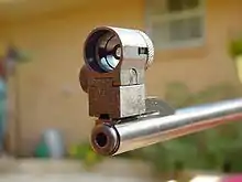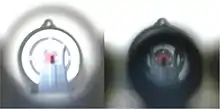 - Варіант контрасту, в якому використовується крапка на мушці з товстим і яскравим білим контуром навколо виїмки цілика.[14]