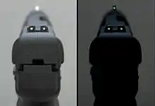 - Популярне на револьверах, це удосконалення складається з кольорової пластикової вставки в лезі мушки, зазвичай червоного або оранжевого кольору.[16]