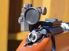 Апертурні приціли для військових гвинтівок мають більший отвір з тоншим кільцем і, як правило, просту мушку зі стійкою.