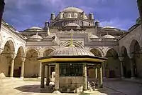 Перед мечеттю є двір оточений різнокольоровими мармуровими колонами та колонами з зеленого змійовика й червоного порфіру, які підтримують купола на арках. Над кожною колоною капітель зі сталактитами. В центрі облицьованого мармуром подвір'я мечеті, оточеного куполоподібною терасою розташовується шадирван (фонтан для омивань). Кипариси надають йому мальовничий вигляд[7]. На цій двір ведуть три входи, один з фасаду, два інших з боків.