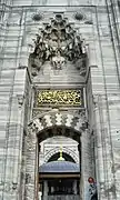 На передній двір ведуть головні парадні ворота, які знаходяться прямо навпроти міхрабу. Ці ворота багато прикрашені сталактитовим розписом, різними орнаментами та написом[8].