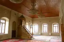 Перед вхідними дверима мечеті розташований відкритий балкон. Молільники здійснюють омивання в басейні, розташованому у дворі мечеті, а потім проходять для здійснення молитви в просторий і світлий зал. У головному молитовному залі встановлено 14 вікон. У передній частині головного молитовного залу знаходиться ще більші за розмірами молитовні приміщення, загальною площею 80 квадратних метрів. 45 з них віддані жінкам, а інша частина використовується як коридор. Мінбар (трибуна) мечеті виготовлений з дерева і прикрашений елегантними ручними візерунками. Висота міхраба, оформленого рослинним орнаментом — три метри[2].