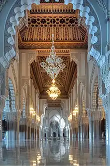 Молитовний зал знаходиться на першому поверсі будівлі. Центральний зал має опалення та забезпечує вражаючий підводний вид на Атлантичний океан. Декорації в залі є вишуканими завдяки залученню до нього 6000 майстрів-ремісників з усього Марокко. Він є настільки великим, що в ньому може з легкістю розміститися будівля Собору Паризької Богоматері або Римського собору Святого Петра.